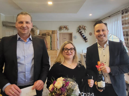 Zum Abschluss des Besuches übergab Bürgermeister Philip Schwaiger noch eine Flasche Fuhrmannssekt und Präsente der Stadt sowie Andreas Briem einen Blumenstrauß im Namen des Gewerbevereins Mengen. Wir wünschen Antonietta Guarda und der gesamten Familie weiterhin viel Erfolg.