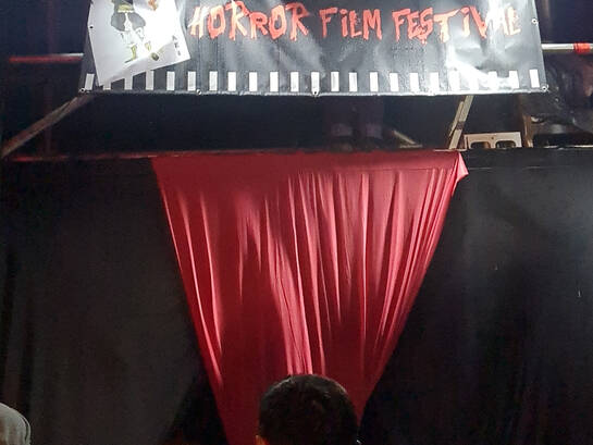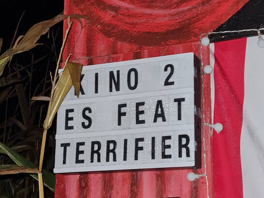 Auf Einladung von Sabine und Miriam Menner, die die „Escape Exit Rooms“ seit 2017 in Mengen betreiben, wollten wir uns in einer kleinen Gruppe selbst ein Bild von dem Grusel-Highlight im Maislabyrinth machen. Nach kurzer Einweisung und einem Warm-Up, wie man richtig „stirbt“ geht’s auch schon los. In diesem Jahr steht das Gruseln unter dem Motto „Horror-Film Festival“. Die insgesamt zwölf Stationen befinden sich in sechs Kinosälen, in jedem wird ein anderer Horrorfilm-Klassiker aufgeführt. Jede Kleingruppe startet in einem eigenen Feld, unseres ist Kino 6 „Hostel“. Nachdem gleich zu Anfang ein Team-Mitglied von dem „Kettensägen-Mann“ entführt wird, stellen wir uns zu viert dem ersten Rätsel. Dazu müssen wir u. a. in blutigem Gehirn-Wasser wühlen.