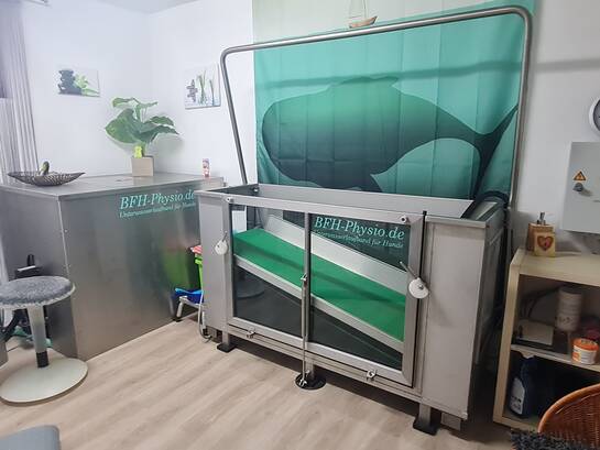 Wie Christine Kinbach im Gespräch erzählt, haben sich die Physiotherapie und Osteopathie im Veterinärbereich seit vielen Jahren etabliert. „Manche Tierärzte bieten schon selbst solche Leistungen an, andere empfehlen mich“ so die Therapeutin. So kommt sie auch zu ihren Kunden – durch Empfehlungen, Mundpropaganda und Vernetzung mit den örtlichen Tierarztpraxen. „Im vergangenen Jahr habe ich an einem Gründerworkshop in Sigmaringen teilgenommen, da brachte mir eine Menge Input für den Aufbau meiner Praxis hier“. Die Leistungen sind vergleichbar mit denen am Menschen. Neben den gängigen Therapien bietet Christine Kinbach auch ein Unterwasserlaufband zum Muskelaufbau und deren Training an.