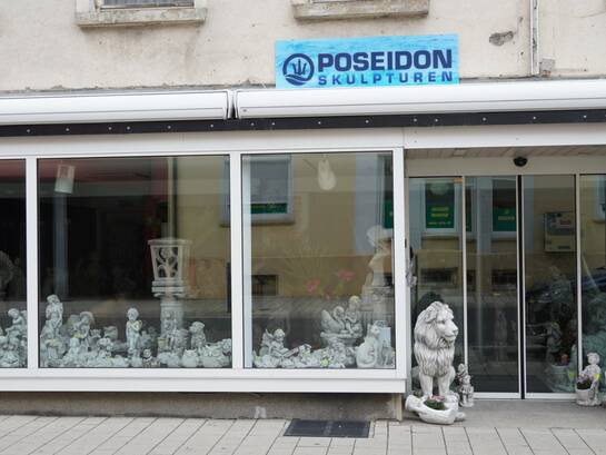 Titelfoto: Das Geschäft „Poseidon-Skulpturen“ in der Hauptstraße 40-42 (Stadt Mengen)