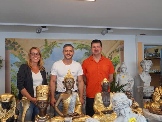 Vor rund zwei Monaten hat Alexander Trauner sein Geschäft „Poseidon-Skulpturen“ in der Hauptstraße 40-42 in Mengen eröffnet. Nach seinem Umzug im März/April von dem ehemaligen Standort in Bingen, konnte er seinen neuen Geschäfts-Standort pünktlich zum Verkaufsoffenen Sonntag Ende April in Mengen eröffnen. Und er ist sehr zufrieden mit seiner Entscheidung, wie er bei dem Willkommens-Besuch von Thomas Dau, Vorsitzender des Gewerbevereins Mengen und Kerstin Keppler, Wirtschaftsförderin der Stadt Mengen, berichtet.